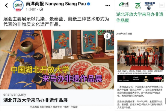 本次在马来西亚举办湖北开放大学非物质文化遗产作品展是我校首次在境外举办此类展览,是学校凝练湖北特色文化成果、秉持“走出去”开放办学理念的新体现。此次展会致力于在中马建立全面战略伙伴关系10周年和共建“一带一路”倡议提出10周年之际,搭建“非遗”交流、文化教育互赏的友谊桥梁,逐渐形成中马两国之间的教育合作文化品牌,进一步夯实“一带一路”教育文化共同体的建设目标。