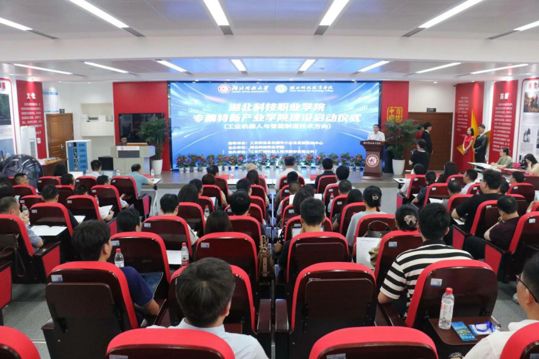 7月13日,骄阳似火,激情四溢,湖北科技职业学院举行工业机器人及智能制造技术专精特新产业学院建设启动仪式。湖北科技职业学院党委书记刘义,教育部职成司原副司长、中国职业教育学会原常务副会长兼秘书长刘占山,工业和信息化部中小企业发展促进中心人力资源研究所副所长陈琛,湖北省经济和信息化厅中小企业发展处处长刘卫军,湖北省教育厅二级巡视员何泽云,清华大学国家服务外包人力资源研究院副院长毛居华,中国职工技术协会职工新技能培训专委会副秘书长张冉冉,高校毕业生就业协会机器人专委会常务副秘书长黄伟,工业和信息化部中小企业发展促进中心人力资源研究所张潇阳出席了启动仪式。会议由副校长宋移安主持。