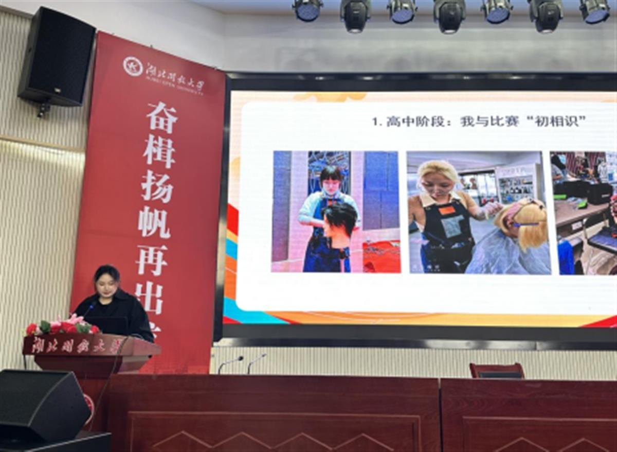 怀揣美发梦想,在18岁那年,程亚林报考了该校传媒艺术学院人物形象设计专业。“来到湖科,学校除了提供技术指导,更在课程设置上让我对人物美感、整体造型有了更深地把握。”程亚林表示,是对专业的热爱,给了她拼搏的动力。大学期间,作为班级宣传委员的她,即使备赛再繁忙,班级事务也从来不落下,积极组织同学们参与各项文体活动,被班级同学推选为入党积极分子,荣获国家级、省级和市级的多项荣誉。学院开展的“领学计划”活动,程亚林作为第一期开讲人,以《虽是毫毛技艺,却是顶上功夫》为题,分享自己参加职业技能大赛的备赛经验、心路历程,并现场进行盘发技能展示,她的分享引发同学们的阵阵掌声。在现场技能展示环节,程亚林用头发做出一朵精美的玫瑰花造型,技艺精巧、灵动逼真,令在场的同学们惊叹不已。