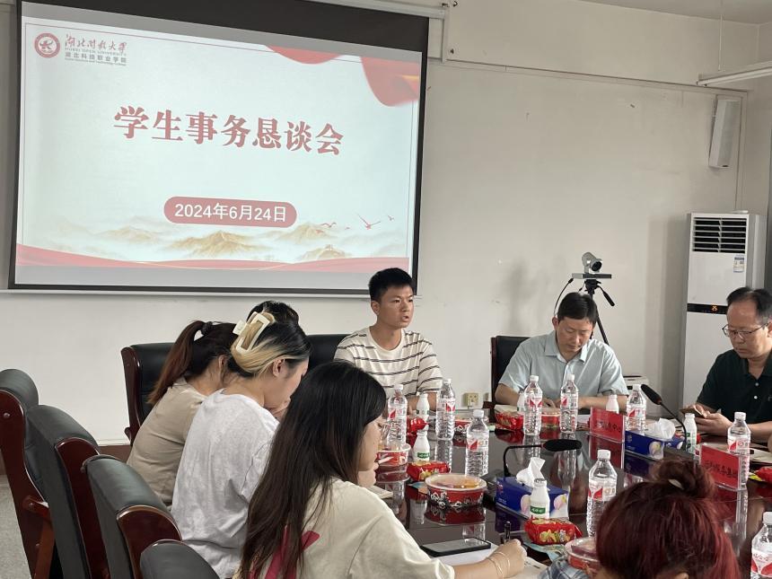 6月24日,湖北科技职业学院举办2024年春季学期“校长午餐会”暨学生事务恳谈会,学校领导、老师与学生代表们围坐一起,共进午餐,交流感受,听取学生意见和建议,提升学校管理与服务水平。校长陈志祥、党委常委李宜兵,学工部(处)、保卫部(处)、团委、职院教务处、资产设备处、基建处、图书信息中心、后勤服务集团等职能部门负责人以及各学院学生代表参加会议。