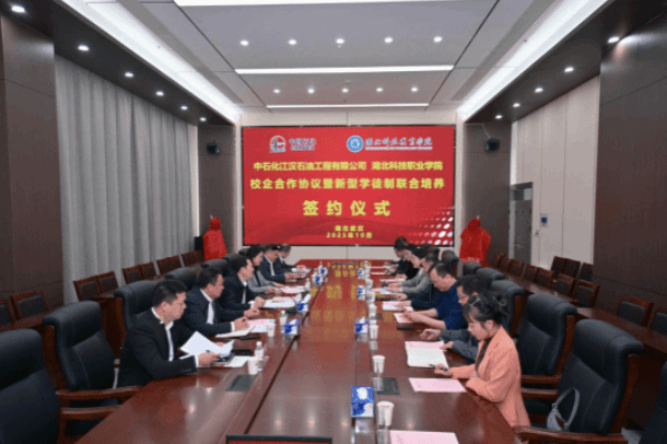 为深化产教融合、推进校企协同育人,湖北科技职业学院与中石化江汉石油工程有限公司于10月17日上午在该校8104会议室举行校企合作协议暨新型学徒制联合培养签约仪式。中石化江汉石油工程有限公司党委副书记陈常山、中国石化集团公司党组组织部高级主管党玉涵及中石化江汉石油工程有限公司党委组织部部长韩家新等一行六人,湖北科技职业学院党委常委、纪委书记、监察专员丁华涛,教务处、校企合作处领导,机电工程学院班子成员和教师代表参加仪式。