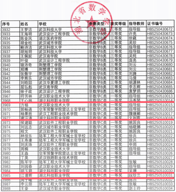 首次出征,载誉而归!近日,湖北省第十四届大学生数学竞赛成绩揭晓。湖北科技职业学院组织30名学子参赛,斩获一等奖4名、二等奖6名、三等奖5名,获奖总数位列全省第四,一等奖获奖人数居全省第五,以亮眼的成绩实现数学学科竞赛征程的“开门红”。