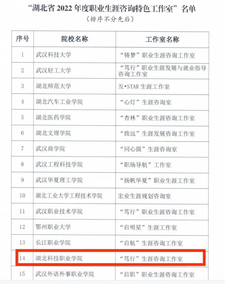 本网讯(通讯员 汤苗苗 王东瑾 文/图)12月28日,湖北省高等学校毕业生就业指导服务中心发布了“湖北省2022年高校职业生涯咨询特色工作室名单”,我校“笃行”生涯咨询工作室成功入选。经高校申报、专家推选,此次一共有15所高校成功入选省级特色生涯咨询工作室,省就业指导中心对入选高校将在今后3年给予每年1万元的建设经费支持。