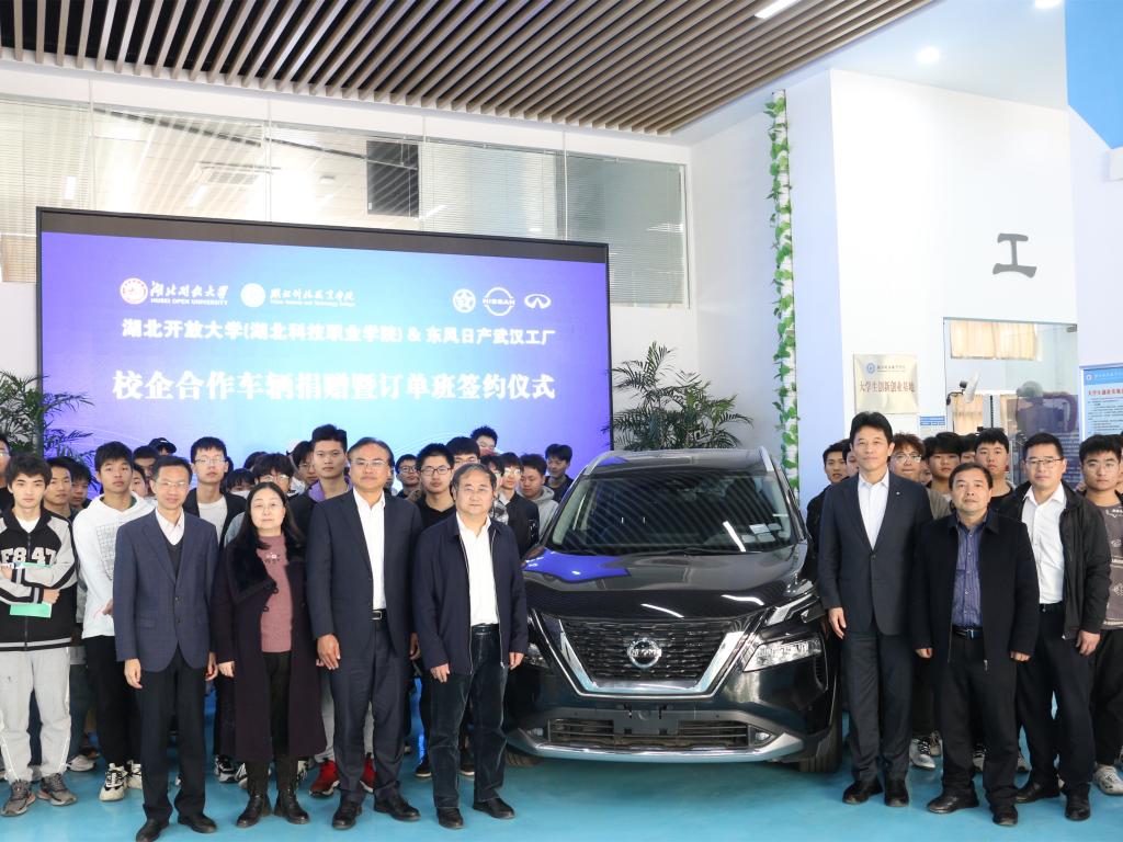 本网讯(通讯员 徐璐/文 毕小艳/图)3月12日上午,东风日产武汉工厂向学校捐赠汽车及东风订单班签约仪式在学校智能制造工厂举行。校长钟毓宁、副校长宋移安,东风有限(东风日产)党委书记王强以及双方相关部门负责人出席捐赠仪式,仪式由职院教务处、校企合作处处长夏学文主持。