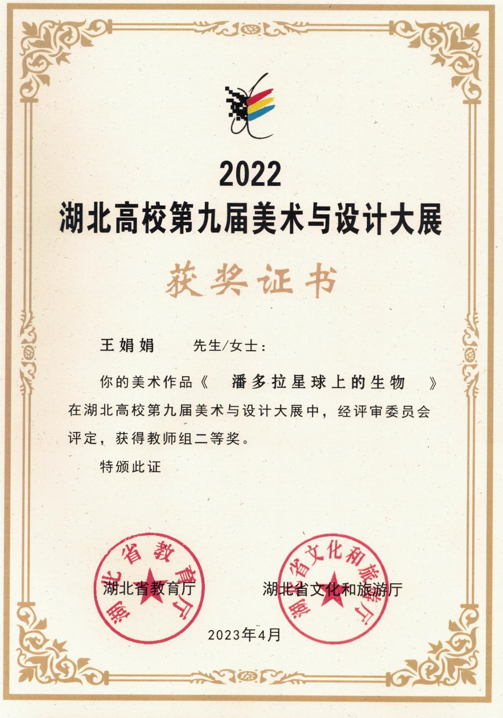 本网讯(通讯员 王甜/文 王娟娟/图)4月17日上午,由湖北省教育厅、湖北省文化和旅游厅主办,湖北省群众艺术馆、湖北省教育科学研究院、中南民族大学光谷美术馆承办的湖北高校第九届美术与设计大展,在中南民族大学光谷美术馆开幕。开幕式上揭晓了本届比赛获奖名单,我校教师王娟娟作品《潘多拉星球上的生物》荣获美术类教师组“二等奖”。