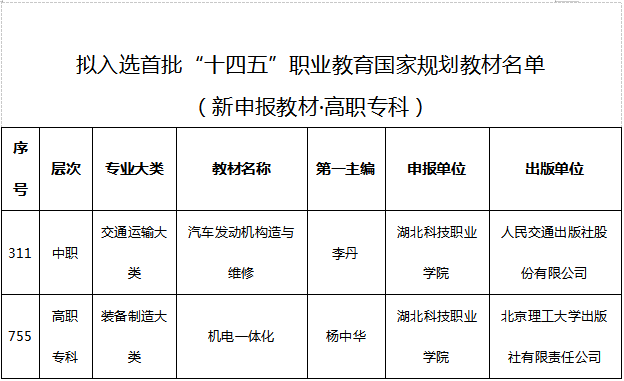 本网讯(通讯员 龚丽丽 文/图)近日,根据教育部发布的《关于拟入选首批“十四五”职业教育国家规划教材名单的公示》文件显示,我校《汽车发动机构造与维修》等4部教材拟入选首批“十四五”职业教育国家规划教材名单。