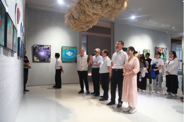 本网讯(通讯员 刘捷文/图)“强烈的色彩感、强烈的生命力、强烈的张力、强烈的时代感”,6月7日上午,党委书记刘义、副校长宋移安一行参观我校青年艺术家王娟娟作品展“幻化的图像”时,不吝赞美之词,在刘义书记看来,作品大胆采用新的材料试验色彩,聚焦神秘和深邃,用抽象和幻化的方式表达出对自然、生命、宇宙的思考,主题创新,艺术语言新锐,彰显了文化自信,同时展现了我校青年教师的创作水平和科研成果。