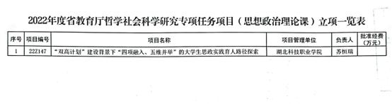 本网讯(通讯员 王维 文/图)近日,从湖北省教育厅获悉,在2022年湖北省教育厅哲学社会科学研究专项任务项目中,我校获批立项4项高校学生工作品牌项目和1项思想政治理论课项目。其中学生工作品牌项目立项数量为历年最高。