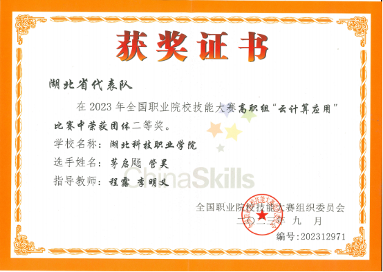 本网讯( 通讯员 程露 文/图)9月18日至21日,由教育部、国家发展和改革委员会、科学技术部、工业和信息化部等36个国家部委、行业协会联合主办,吉林省教育厅、长春市人民政府共同承办的2023年全国职业院校技能大赛(高职组)“云计算应用”赛项在长春汽车工业高等专科学校举行。我校电信工程学院茅启飏、管昊两位同学组成的代表队,在指导老师程露、李明义的悉心指导下,不畏强手,奋勇拼搏,以全国第15名(共60支代表队)的成绩荣获二等奖。