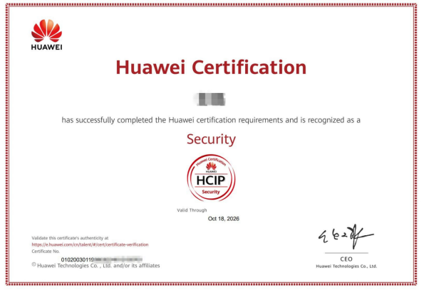 本网讯(通讯员 朱珺 王宇豪 文/图)10月19日,2023年HCIP-Security(安全)成绩新鲜出炉,湖北科技职业学院电信工程学院信息安全技术应用专业20名参加认证的学生取得优异成绩,全员通过认证并获得HCIP-Security(安全方向)高级工程师证书。