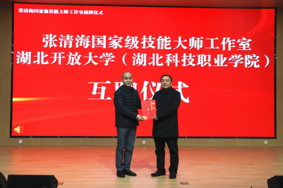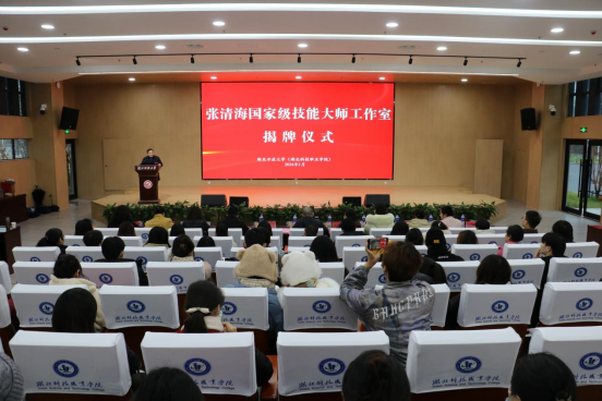 本网讯(通讯员 陈蔚/文 李贺刚/图)1月16日,我校在关山校区新学术报告厅举行了张清海国家级技能大师工作室揭牌仪式,标志着国家级技能大师工作室正式入驻我校。副校长宋移安、国家级技能大师工作室领办人张清海、武汉沧月幽兰文化有限公司董事长王银环等出席仪式。