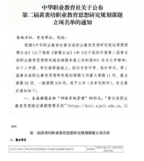 本网讯(通讯员 李开泉/文 刘珍珍/图)根据《中华职业教育社关于公布第二届黄炎培职业教育思想研究规划课题立项名单的通知》(社发〔2024〕2号)获悉,我校传媒艺术学院欧亚梅老师主持的《黄炎培美育思想视角下的高职非遗创新实践研究》(ZJS2024ZN021)获重点课题立项。第二届黄炎培职业教育思想研究规划课题面向全国高校申报,其中重点课题申报521项,立项55项。