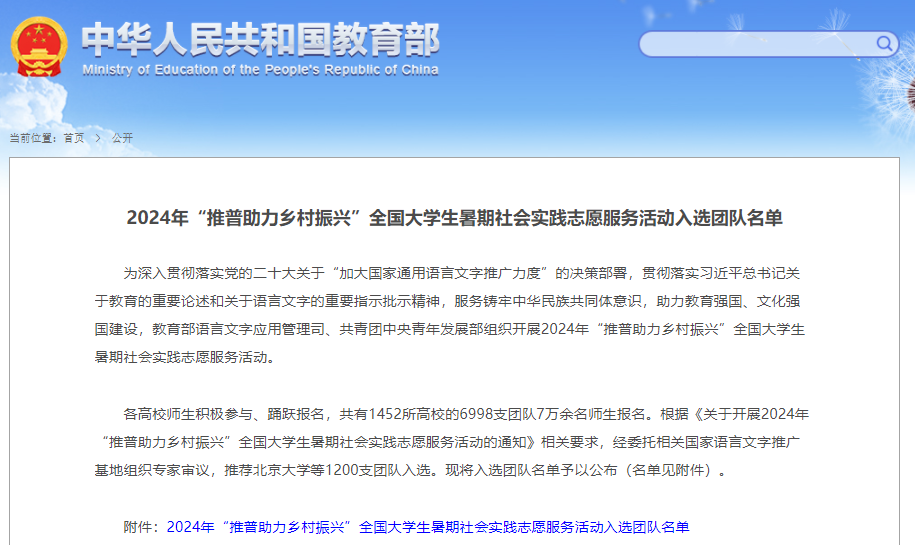 本网讯(通讯员 雷楹 肖莉山/文 雷楹/图)7月2日,教育部语言文字应用管理司、共青团中央青年发展部公布了2024年“推普助力乡村振兴”全国大学生暑期社会实践志愿服务活动入选名单,全国共有1452所高校的6998支团队7万余名师生报名。我校经济贸易学院头雁推普志愿服务队成功入选。