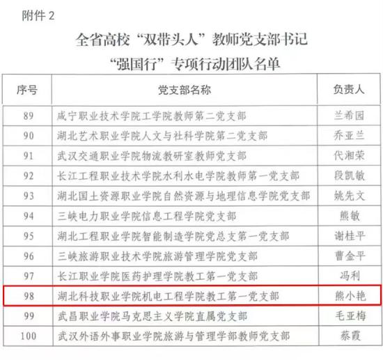 本网讯(通讯员 郭兵 文/图)近日,省委教育工委公布全省高校“双带头人”教师党支部书记“强国行”专项行动团队名单,我校机电工程学院教工第一党支部成功入选。这是我校在基层党组织建设中的又一次新突破,也是学校以高质量党建引领高质量发展过程中取得的重要成果。