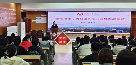 本网讯(通讯员 欧阳简娣/文 欧阳简娣 李贺刚/图)为了深入学习党的二十届三中全会精神,引领学生积极承担时代责任,10月28日和29日上午,校长陈志祥以《德技双修,勇担服务湖北区域发展使命》为主题,在思政讲堂分别为软件工程学院和人工智能学院师生讲授了一堂别开生面的思政课。