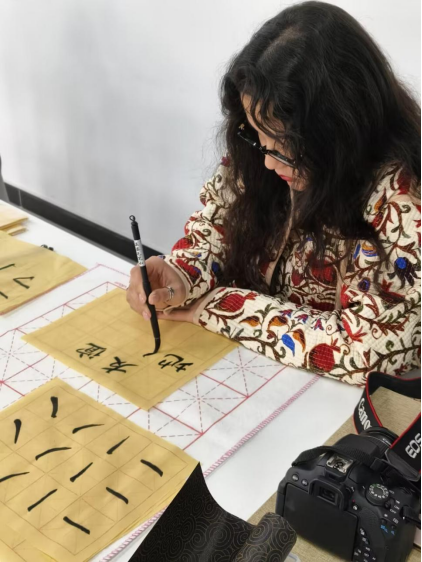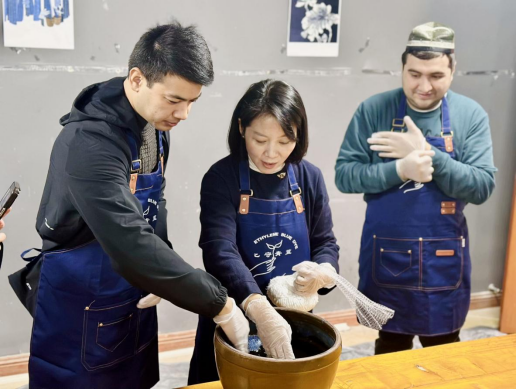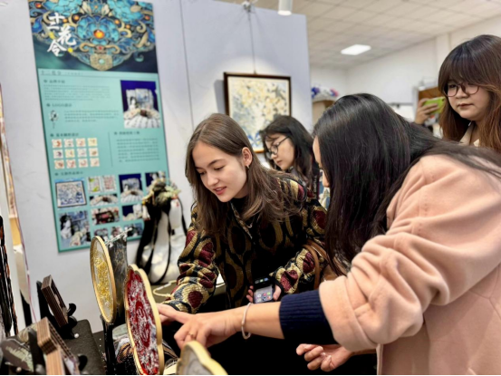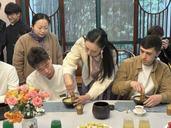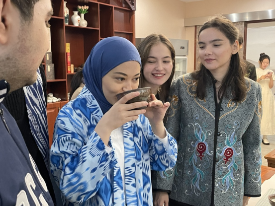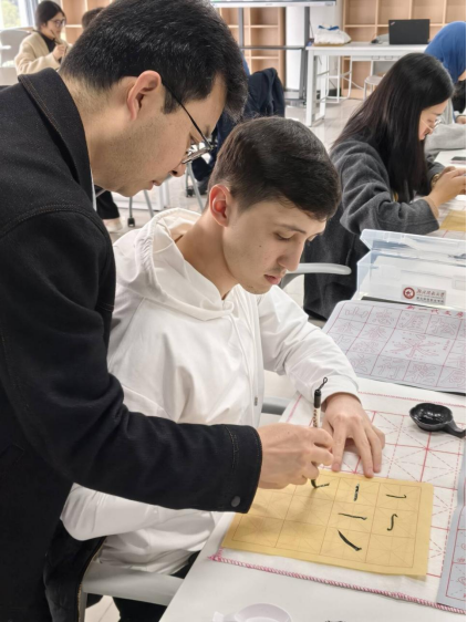 在艺术创意学院,国际学生观看了毕业设计作品展,亲身体验了漆扇制作和蓝染技艺。漆液留驻在扇面上形成图画的妙趣天成以及植物蓝靛“布里生花”的浑然天成,将中国传统文化的瑰丽精致展现得淋漓尽致。他们展示着自己亲手制作的作品,纷纷赞叹称奇,表示对荆楚传统文化有了更深刻的感悟。在工商管理学院,大家感受了宋代风雅“四艺”即焚香、点茶、挂画、插花的视听盛宴,亲自动手进行了仿宋点茶实操以及香丸制作,沉浸式感受了中国传统文化的独特韵味。他们表示,这些精妙的传统艺术深深震撼了他们,这些古老技艺不仅是中国文化的瑰宝,更是全人类共享的精神财富。在经济贸易学院,师生共同体验了书法之美,笔墨纸砚一一排开,领略汉字笔画间的深邃韵味,在老师的指导下,国家学生们与我校学生用毛笔共同书写了“友谊地久天长”的美好愿望。在校外实践教育基地湖北省博物馆,同学们与文物对话,触摸荆楚故事,探寻了荆楚大地悠久历史与灿烂文化的精髓。
