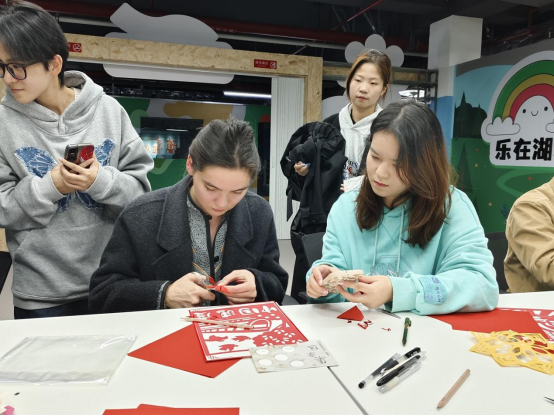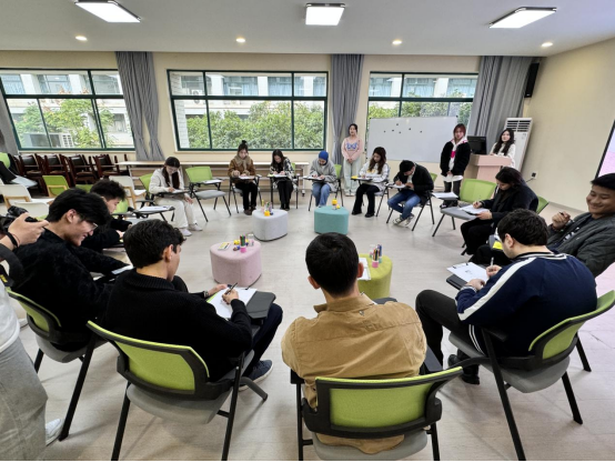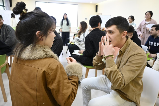 在心理健康教育中心,中外学生们共同开展了一场跨文化人际互动团体辅导活动,同学们绘制自画像并相互介绍了自己,拉近了彼此的距离。在“沟通接力”游戏中,中外学生们跨越语言障碍,凭借丰富的肢体表达和敏锐的观察力,成功完成了信息传递。他们表示,尽管大家国籍、语言和生活习惯大不相同,但彼此之间仍存在许多共同点,初次见面就像老朋友一样。在大学生活动中心,我校学子为国际学生们带来了琴棋书画、歌舞展示、汉服表演、国球交流等丰富多彩的活动,中外学子青春洋溢、汇聚一堂、深入交流、其乐融融。中国学生和中亚学生们一起载歌载舞、写书法、学剪纸、切磋乒乓球,来自乌兹别克斯坦的G.A.D还主动上台演唱了家乡的歌曲。通过这种形式的文化交流,中外学生们增进了了解和友谊,在欢声笑语中进行了更深层次的互动。