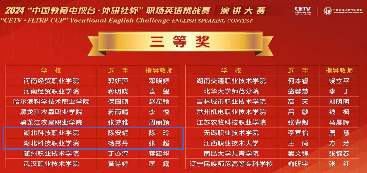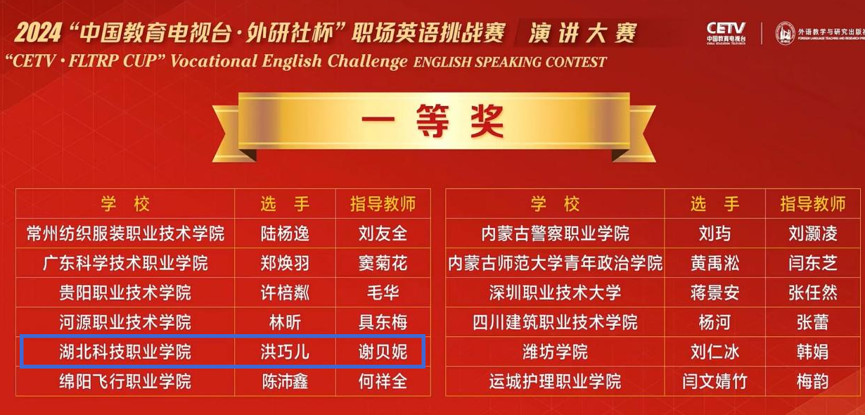 本次大赛从5月开始启动,历经校赛、省赛、全国网络赛和全国总决赛的层层选拔。在过去的半年中,我校英语教学团队不断升级备赛模式,优化赛事指导方案,力求全方位提升学生的竞争力。洪巧儿在省赛中以总分第三的骄人成绩代表湖北省出征全国决赛,陈安妮和杨秀丹以网络赛场特等奖的优异成绩晋级全国决赛。我校首次获得本项赛事的国赛资格,并一举获取3名全国决赛晋级名额,在全国兄弟院校实为罕见,不仅创下了湖北省参赛院校单次晋级国赛的最高纪录,也成为与深圳职业技术大学、浙江交通职业技术学院并居全国决赛名额之首的三所院校,为学校在全国范围内赢得了广泛关注和高度美誉。