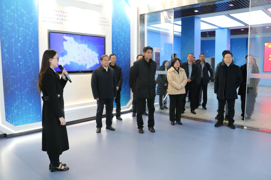 王启明一行在校领导陪同下实地参观考察了学校终身教育馆、非遗教育成果展室、全景演播室、社区教育学院等场所,详细了解湖北开放教育体系建设、教育数字化转型发展和数智赋能大规模个性化学习等方面的情况,并与校领导和相关老师进行深入交流。
