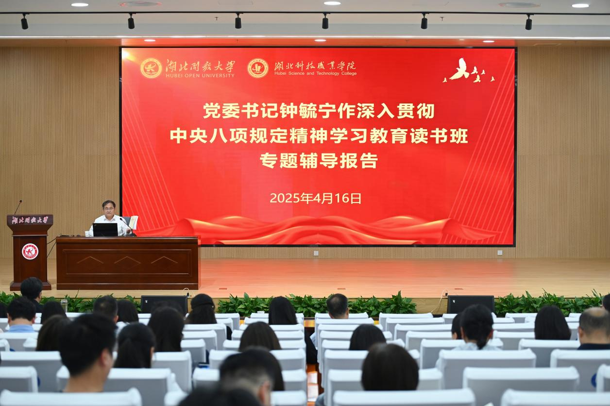 本网讯(通讯员 肖凌瑶/文 刘捷/图)4月16日下午,学校举办深入贯彻中央八项规定精神学习教育读书班第二次集中学习。党委书记钟毓宁作专题辅导报告,全体校领导、中层领导干部参加学习,会议由党委副书记、校长陈志祥主持。