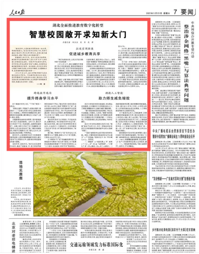 本网讯(通讯员 刘捷/文 李贺刚/图)5月23日,《人民日报》要闻版在“湖北全面推进数字化转型智慧校园敞开求知新大门”专题新闻中,对我校跨越数字鸿沟、提升终身学习水平的创新实践进行深度报道,对内进一步凝聚了人心士气合力,对外进一步提升了学校美誉度和影响力。