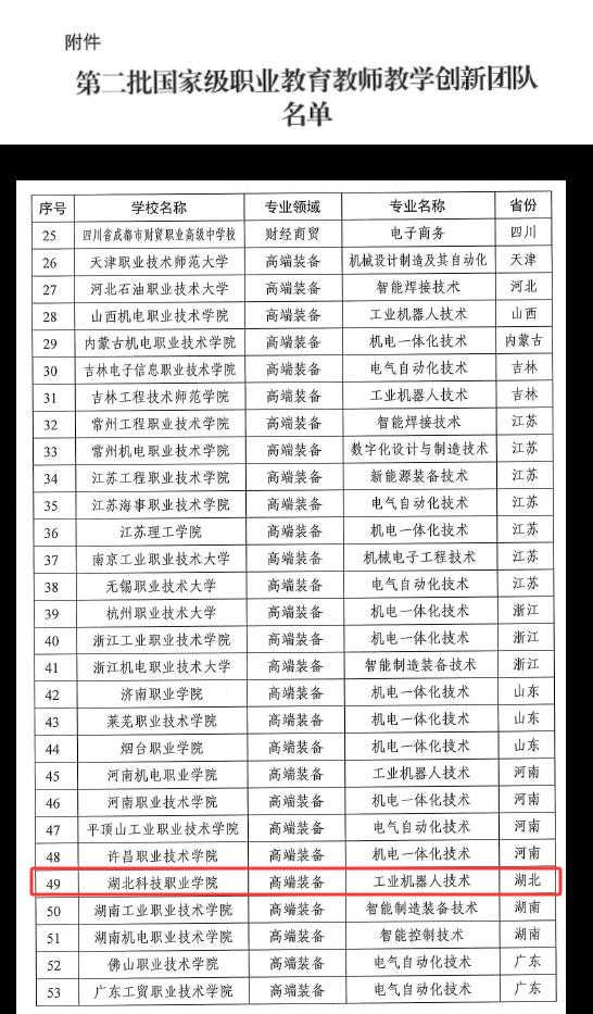 本网讯(通讯员 熊小艳、卢志芳 文/图)近日,教育部公布了第二批国家级职业教育教师教学创新团队名单,我校工业机器人技术专业教学团队经过三年多的建设,最终通过验收,成功获得国家级认定。本批共有240个团队入选,我校团队作为高端装备领域的代表名列其中。
