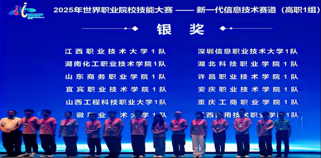本网讯(通讯员:肖玉/文 王智超/图)9月7日至12日,2025年世界职业院校技能大赛新一代信息技术赛道高职组争夺赛在江苏常州举行,来自全国28个省(自治区、直辖市)的251支代表队、1000余名青年技能选手同台竞技,彰显综合技能。软件工程学院王智超、肖玉老师指导,软件技术专业蔡燕玲、梅智伟、潘金凤、龚智辉 4名同学组成的团队,经过激烈角逐,最后以小组第二的成绩获得银奖。