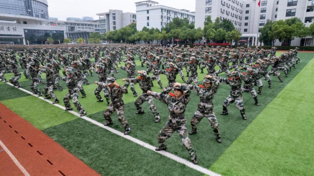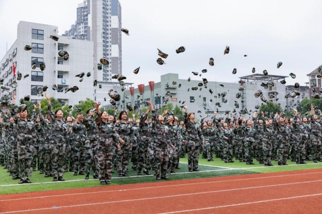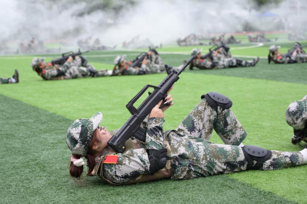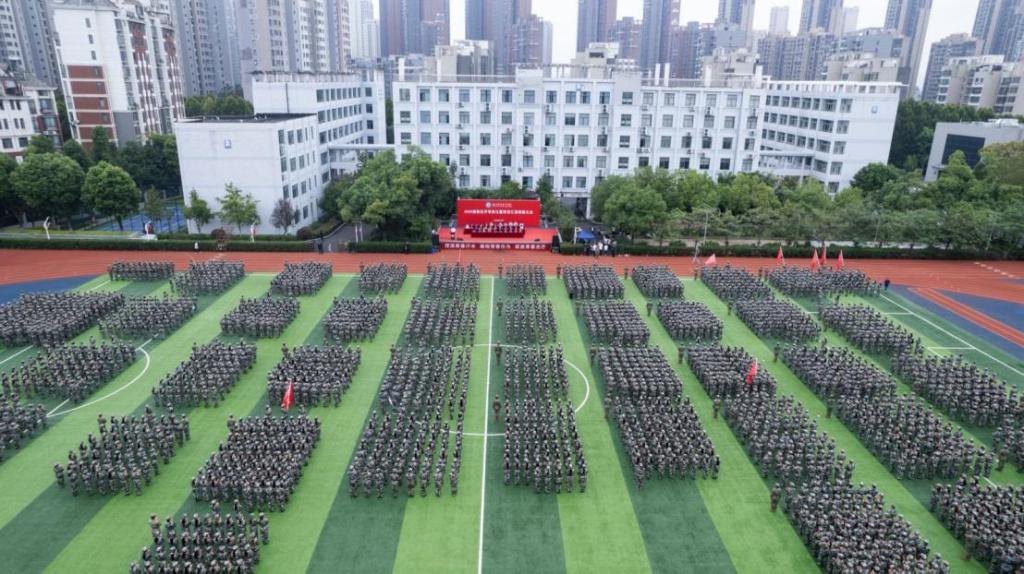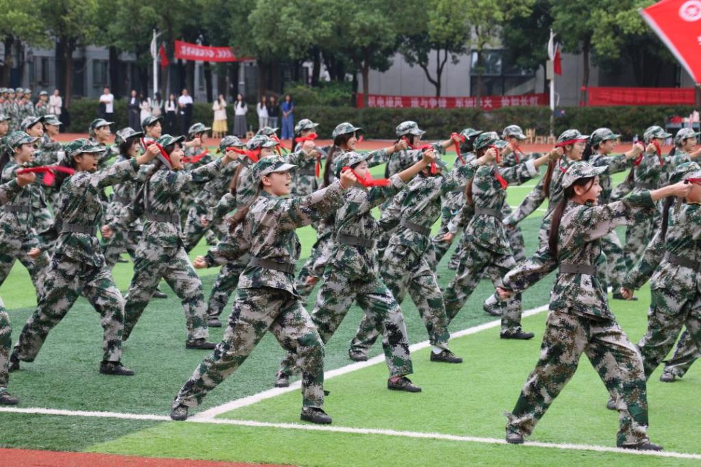 随后,军训汇演正式开始。在激昂的旋律中,特色方阵依次登场,以饱满的精神状态展现14天军训的丰硕成果。匕首操方阵动作刚劲有力,寒光闪烁间尽显巾帼风采。她们手持短刃,一招一式刚柔并济,展现出别样的飒爽英姿。擒敌拳方阵步伐沉稳铿锵,拳影翻飞间尽显青春担当。他们足踏实地,一拳一腿刚猛凌厉,展现出热血的昂扬姿态。“战术对抗”表演更是将现场气氛推向高潮,新生们模拟实战场景,卧倒、匍匐、冲锋,每一个动作都精准到位,充分展现了顽强的意志品质和过硬的纪律作风。