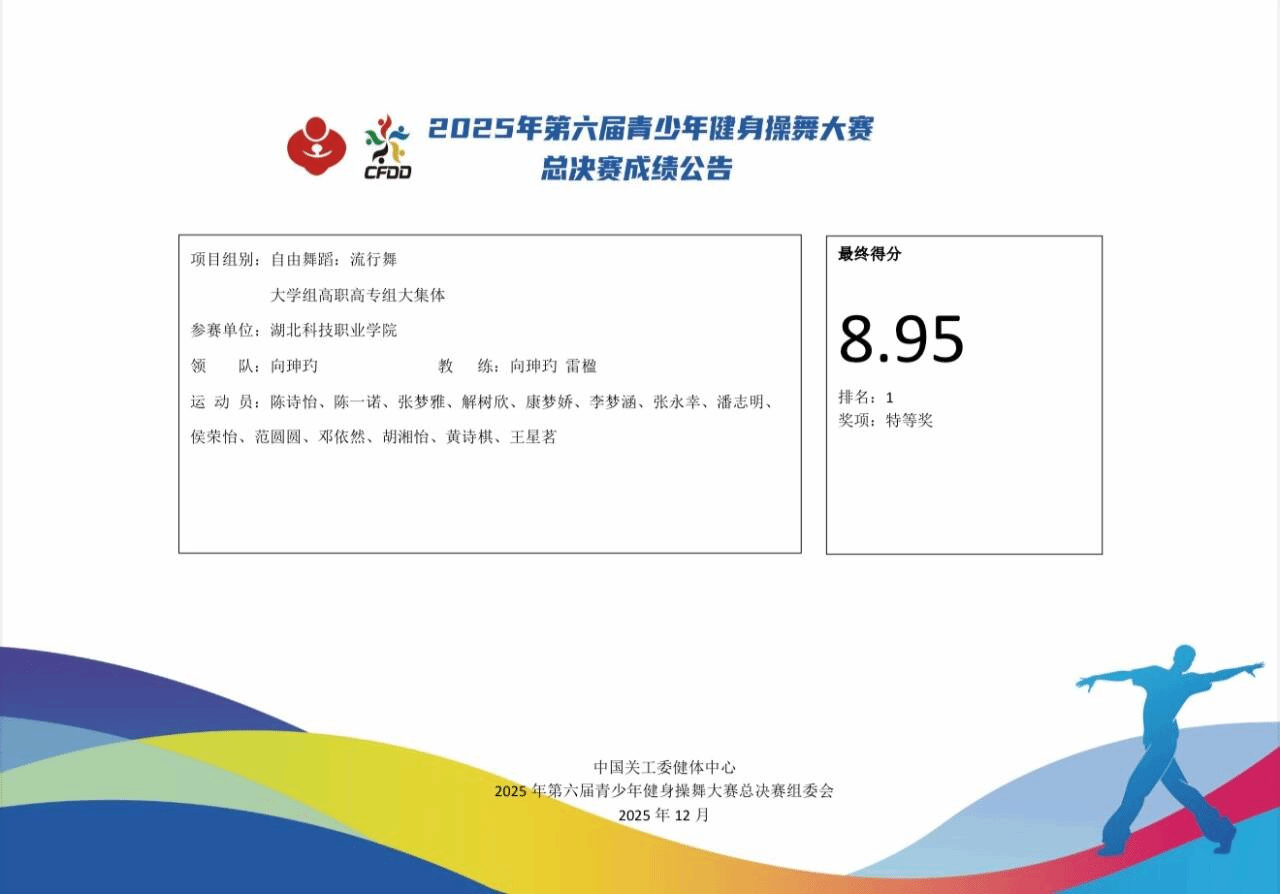 本届总决赛高手云集,竞争激烈。我校学子延续省赛夺冠的昂扬气势,在备赛阶段精益求精,对动作细节、音乐配合与队形编排反复锤炼,在保持原创特色的基础上不断提升艺术表现力。赛场上,队员们动作整齐划一,表现富有感染力,生动诠释了健身操舞的运动之美与团队精神,最终赢得评委一致认可,摘得赛事最高荣誉。