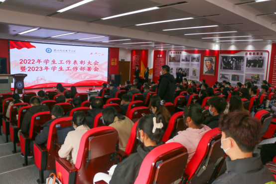 本网讯(通讯员 杨星星/文 孙彬 秦粤 汪澜/图)为全面贯彻落实党的二十大精神,以高质量学生工作助力学校高质量发展,营造“对标先进,比学赶超”干事创业良好氛围,2月20日下午,我校在思政大讲堂召开2022年度学生工作表彰大会暨新学生工作部署会。校党委常委李宜兵出席会议,学工部、宣传部、保卫部、职院教务处、马克思主义学院、后勤服务集团负责人,各学院党总支书记、全体辅导员,学工部、团委全体人员参会。