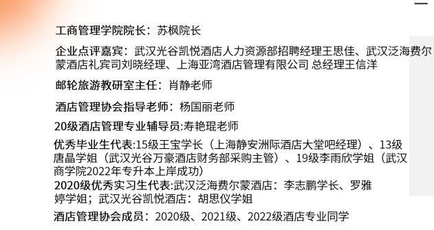 三位优秀实习生向学弟学妹们分享了自己在各自部门的工作经验与收获,并结合实习体会对学弟学妹的实习准备提出了较好的建议。武汉光谷凯悦酒店和武汉泛海费尔蒙酒店的经理们对他们实习期间的工作表现给予了高度肯定,认为他们积极乐观的实习态度为学弟学妹树立了很好的学习榜样。