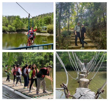 午餐过后,大家带着满心的欢喜前往山下的乡村欢乐谷,体验了划竹筏、荡秋千、水上飞索、水上梅花桩、水上钢丝等娱乐项目。在这里,老师们沉浸在妩媚的春风中,沐浴在明媚的阳光里,暂时卸去了平日工作里的繁忙,尽情享受着春日的美好。