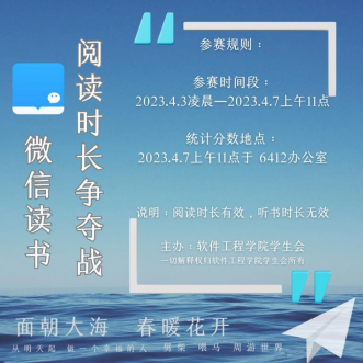 阅读,不止一天。为激发学生阅读热情,学院于4月1日至20日开展了“阅读时长争夺战”活动,一场奇妙的智趣之旅如约开跑。学生们通过微信读书APP,加入学院专属阅读群组,参与到紧张刺激的沉浸式阅读“马拉松”中。在这场思维的长跑中,大家争分夺秒,潜心研读,互相鼓励,共同进步,从经典名著到现代畅销书,从人文哲学到自然科学,涉及多个领域。最终,用功读书的学子们在榜单上留下了自己的荣誉印记,留下了一段难忘的读书回忆,也激励着身边的同伴在求知的道路上不断前行。