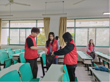 志愿清扫校园,以劳强体。在五一劳动节前夕,学院“志愿同行”工作室开展了“劳动节向劳动者学习”主题活动。扫地、擦黑板、清洁讲台、清空抽屉垃圾……志愿者们对5号教学楼各教室进行全面清扫。为了感谢校内环卫工人为美化校园做出的努力,志愿者们向校内环卫工人赠送了洗衣液,感激的同时也向他们学习劳动精神。