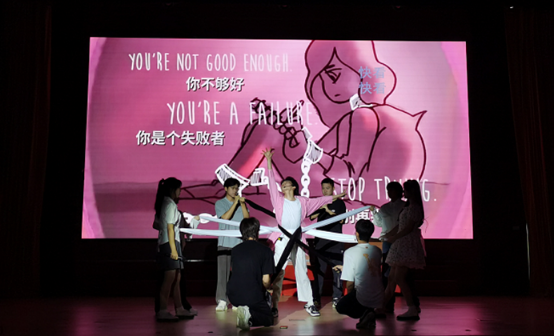 “男生不能穿粉色衣服” “长得好看才能被接纳”“失败了就是自己不行”“与人交往会被人嘲笑”……这些“标签、定义、不良认知”就像根根绳索束缚着剧中人,无力前行。在老师同学的鼓励帮助下,主人公经过艰苦卓绝的努力和反省,层层蜕变,最终挣脱束缚,正确认识自我、接纳自我、喜欢自我、健康成长。现场阵阵掌声、笑声、唏嘘声、喝彩声……演员饱含深情,观众笑中带泪,剧目促人反省,助人成长。