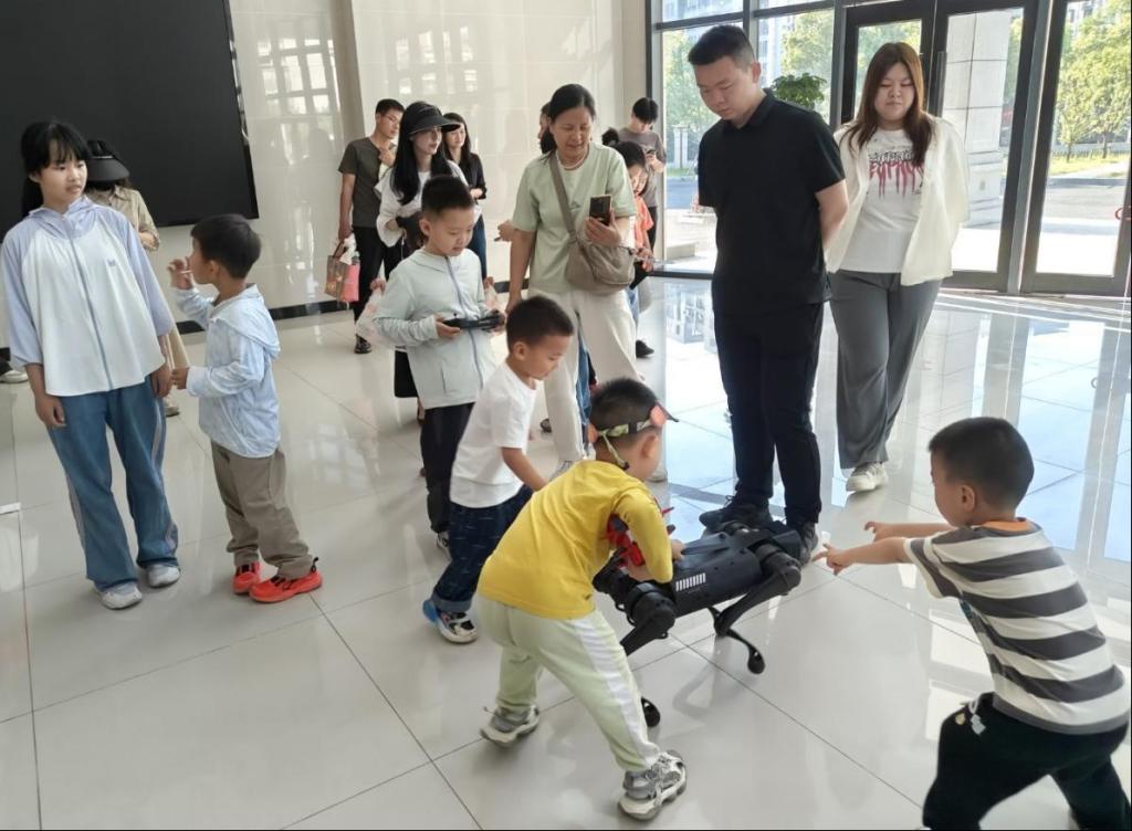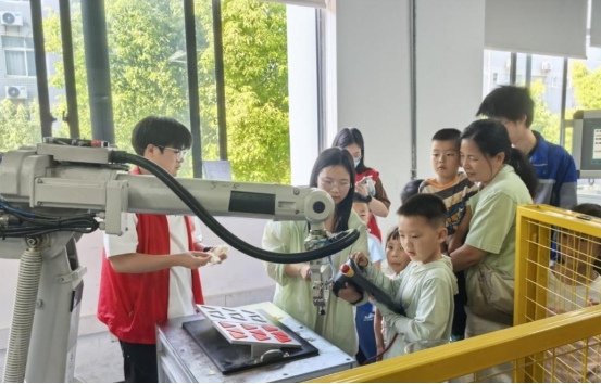本次活动共分为:智能机器狗、3D打印、智能遥控车、智能制造生产线、工业机器人等五个体验环节。在3D打印创客空间,孩子们通过“设计-建模-打印”全流程观摩,见证平面图纸跃升为立体模型的神奇蜕变。智能工厂展区里,全自动生产线行云流水的运作引发阵阵惊叹,工业机器人精准完成搬运、码垛等高难度动作时,小观众们自发响起的掌声此起彼伏。在工业机器人基础实训室,孩子们在学生志愿者指导下,通过机器人示教器指挥工业机器人完成物品抓取,首次体验到人机协作的科技魅力。人工智能展区更是成为人气爆棚的“未来实验室”,AI对话机器人机智应答、机器狗精准避障,让少年们切身感受到科技改变生活的无限可能。