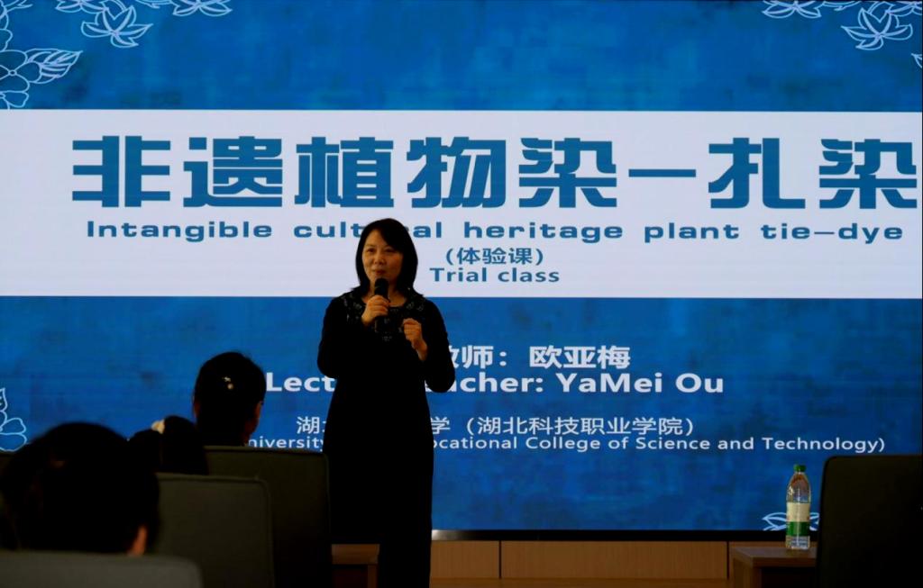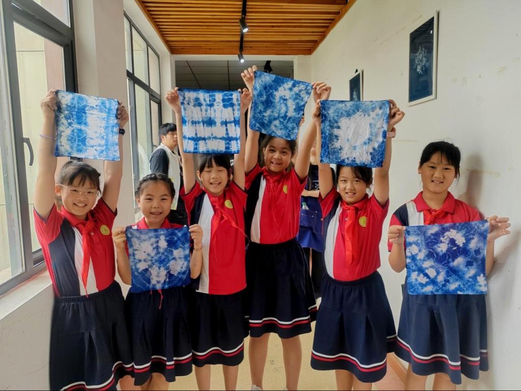 我校非遗项目负责人欧亚梅老师以“非遗植物染——扎染”为题,生动介绍了传统植物蓝染文化与扎染技艺流程。课程实践环节,学生志愿者分组指导大花岭小学师生完成蓝染项目化课程。当靛蓝色在织物上晕染出独特图案时,传统工艺在校校传递中焕发新生。