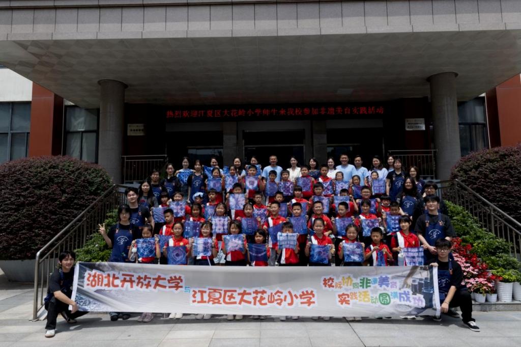 本网讯(通讯员 叶梦/文 王芳/图)6月4日上午,江夏区大花岭小学副校长陈浩、王文俊带领师生一行52人走进湖北开放大学,在“校校协同构建非遗美育共同体”实践活动中共探非遗魅力,我校艺术创意学院领导班子及师生代表参加了此次活动。