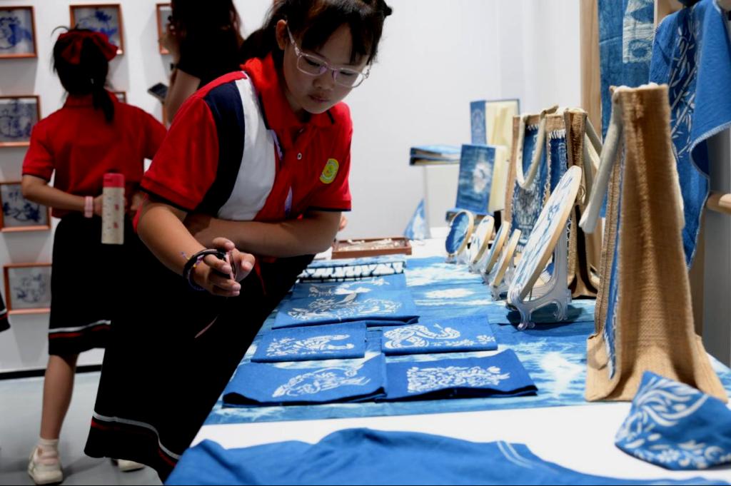 活动伊始,大花岭小学师生步入我校荆楚非遗文化职教传承研究中心,先进的数字技术将荆楚非遗以全新方式呈现:“非遗数字人”通过语音问答与大家展开交流;非遗蓝染展厅内,传统蓝染工艺与现代设计理念结合的作品,展现独特艺术魅力;AI智能化妆镜的互动体验,让孩子们异常兴奋。武汉剪纸大师工作室内,师生团队的精湛技艺令众人惊叹。展厅大屏播放着动漫专业学生制作的动画片,非遗空间营造了轻松活泼的氛围,让非遗以更贴近青少年的方式融入,全面体验传统文化魅力。