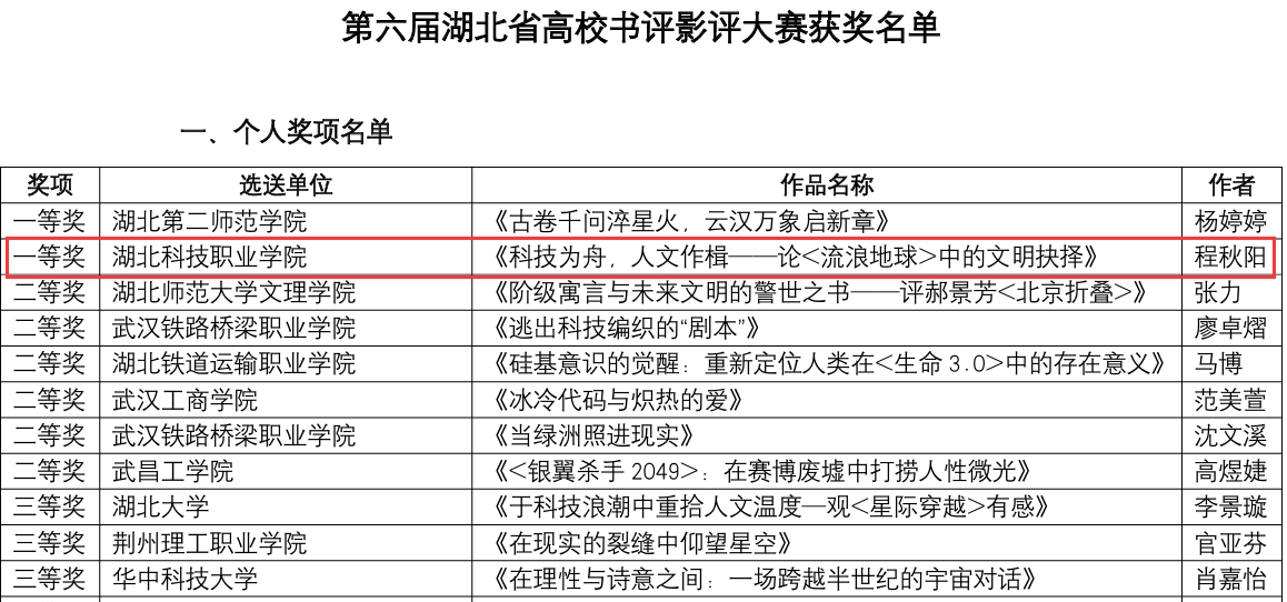 本网讯(通讯员 尹锦育 文/图)近日,第六届湖北省高校书评影评大赛评选结果公布,我校经济贸易学院学生程秋阳的作品《科技为舟,人文作楫——论<流浪地球>中的文明抉择》在这场汇聚全省众多本、专科院校学生优秀作品的赛事中脱颖而出,斩获一等奖,图书信息中心尹锦育获评“优秀指导老师”称号,这是我校首次在该项赛事中摘得桂冠。
