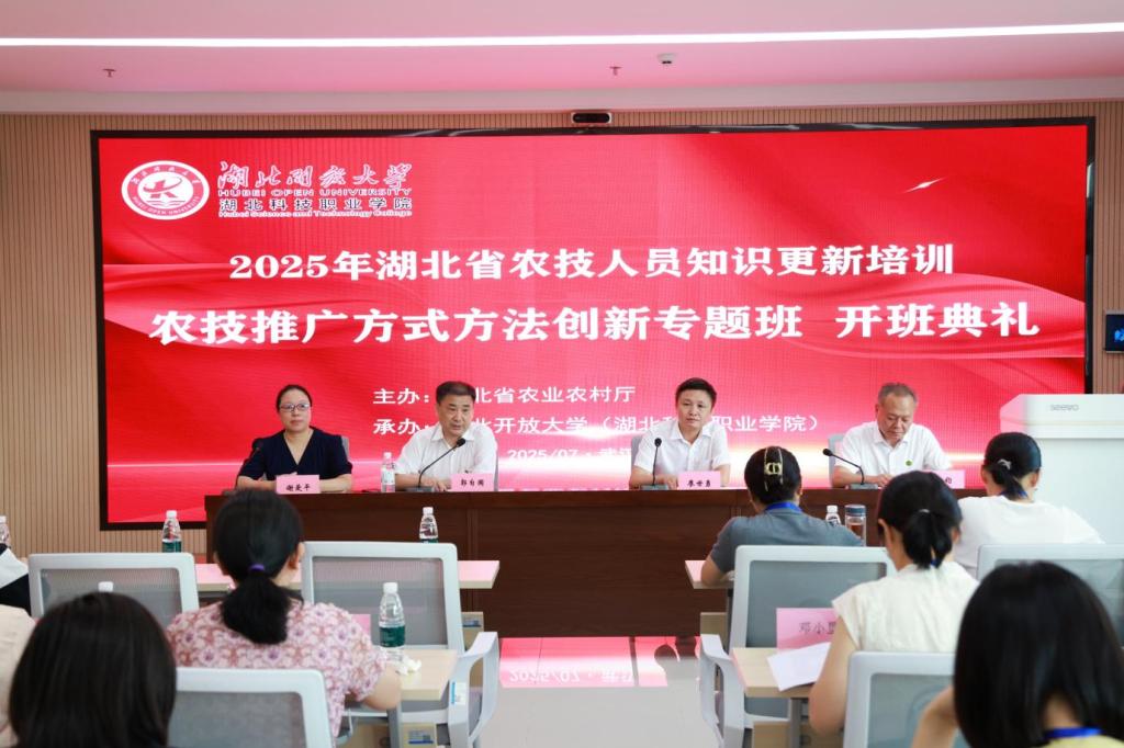 7月15日,湖北省农业农村厅科技人才办公室主任廖世勇出席开班仪式并讲话。湖北省农业广播电视学校副校长陈钧、我校工商管理学院副院长出席。开班仪式由湖北省农业广播电视学校常务副校长郭自国主持。