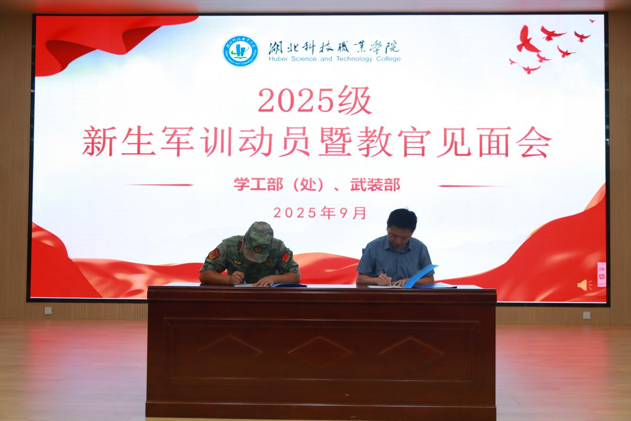 随着嘹亮的国歌声响起,会议正式开始。校团委副书记宣读《成立湖北科技职业学院2025级新生军训团的决定》。学工部(处)、武装部副部长与2025级新生军训团团长签订《教官权责告知书》《安全管理责任书》和《军训教官守纪承诺书》。这三份文件的签订不仅体现了学校对军训安全与纪律的高度重视,更为即将开展的军训工作奠定了坚实的制度保障。