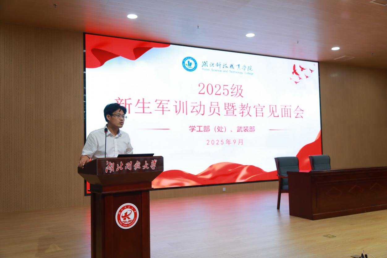 本网讯(通讯员 王吉/文 大学生记者:蔡迪嘉恒/图)9月13日下午,我校在关山校区综合实训楼报告厅举行2025级新生军训动员暨教官见面会。学工部(处)、武装部、团委负责人,蔡甸区武装部50名民兵教官,各学院学工办主任、全体新生辅导员和新生代表参加会议。