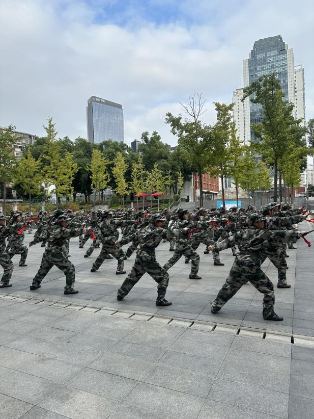 铁血匕首操:汗水里的青春锋芒。“握刀!刺!劈!撩!”伴随着教官铿锵有力的指令,艺创学子身着迷彩服,手持模拟匕首,动作整齐划一、干脆利落。阳光下,他们的眼神坚定如炬,手臂摆动间尽显力量,每一个 “刺向目标” 的动作都饱含决心,每一次 “格挡防御” 的姿态都透着无畏。