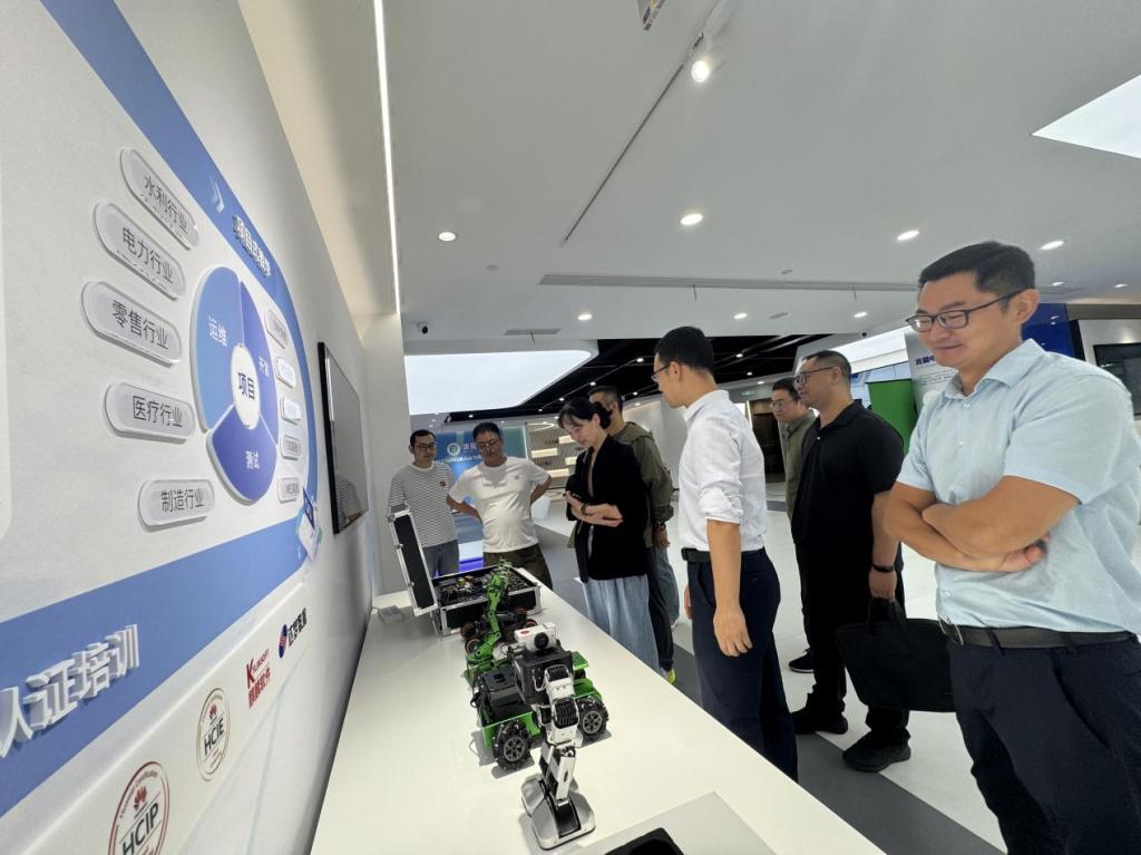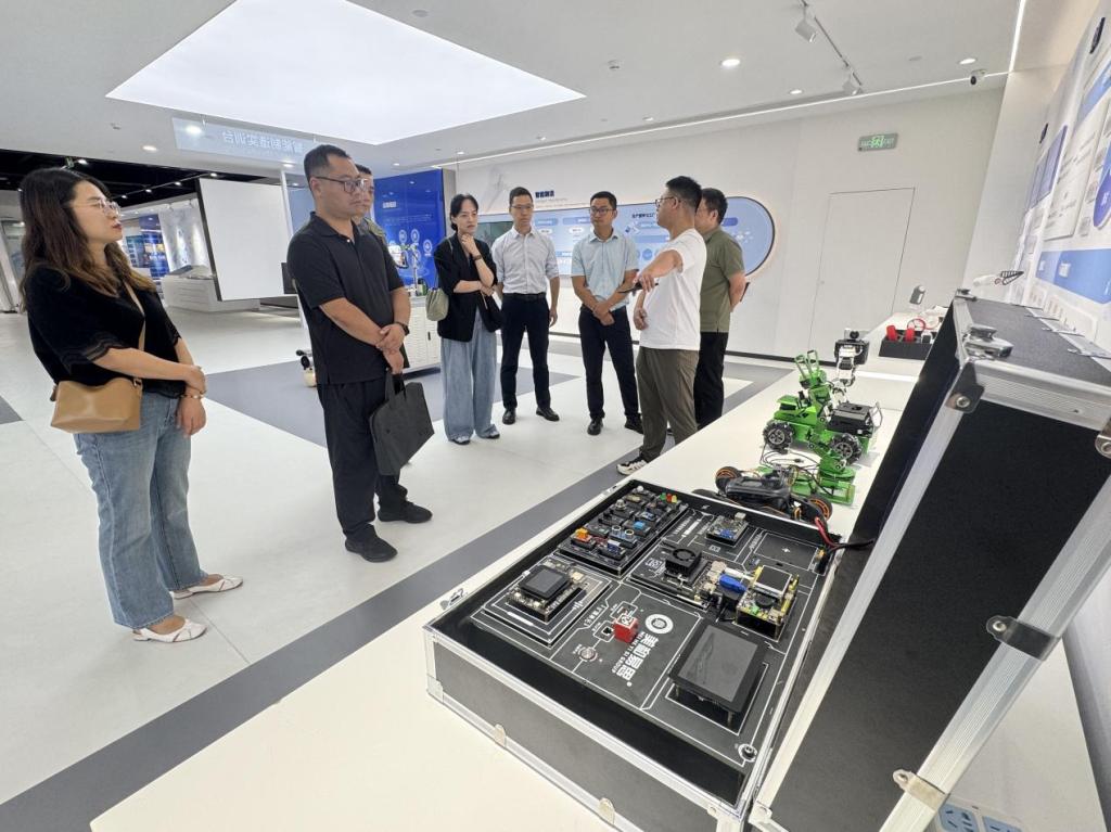 调研团首先参观了美和易思一楼文化科技展厅。公司秉持着“引领未来教育,赋能技术人才成长”的核心理念,从知识产权实力到各级政府荣誉,全方位展现了美和易思在科技研发与产业服务领域的积淀,通过“新技术、体系化课程、实战就业、权威认证”四大模块,展现美和易思从产业需求到教育服务的全链条能力。智能机器人、AI面试舱、理虚实一体化平台等展品,更让教师们直观感受到科技与教育的融合场景。