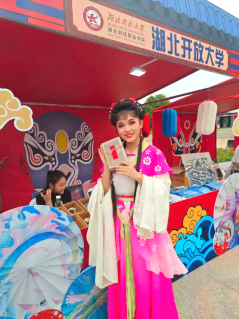 本网讯(通讯员 欧亚梅 张静/文 齐慧/图)10月2日,湖北卫视《戏码头》栏目打造的“戏码头·戏曲嘉年华”大型文化活动在汉口江滩三阳广场启幕,我校作为特邀单位参与本次活动,并在“国潮文化市集”中设立独立展区。由艺术创意学院师生共同创作的非遗文创作品一亮相,便成为市集焦点,其独特的艺术魅力与创新设计赢得了现场观众与活动主办方的高度赞赏。