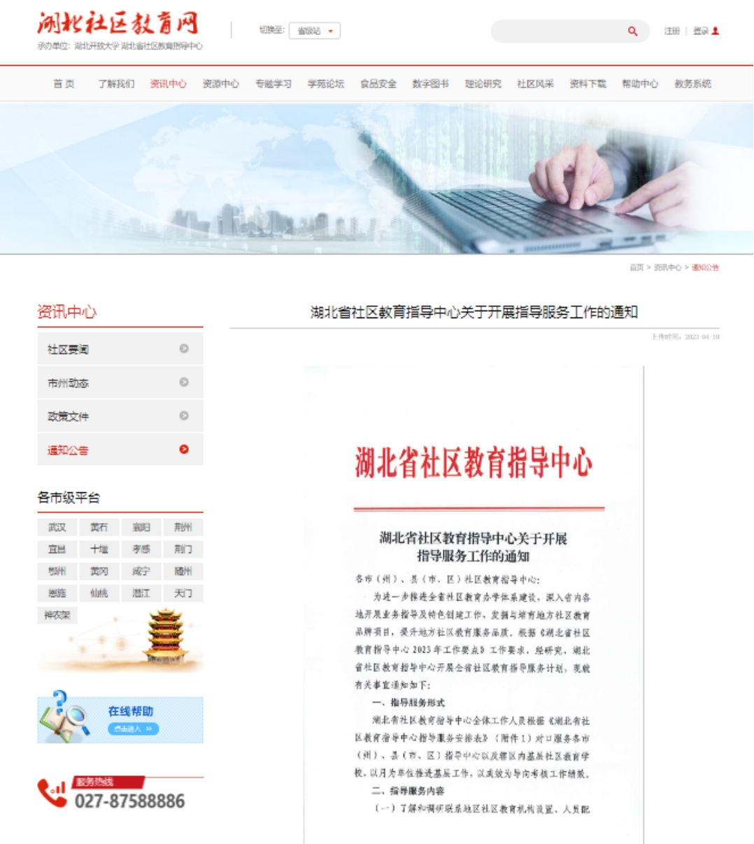 《湖北省社区教育指导中心关于开展指导服务工作的通知》截图